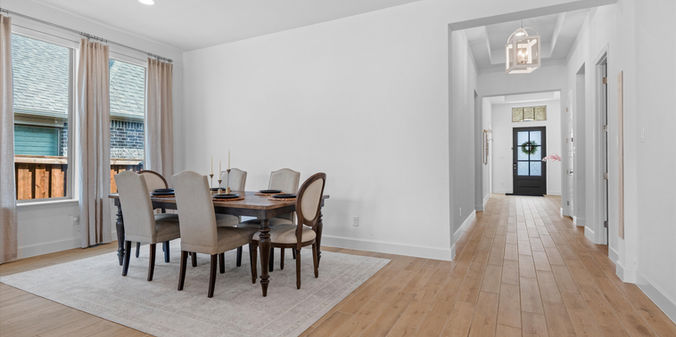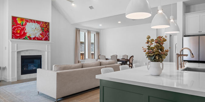 The adjoining living room is bathed in natural light, anchored by a fireplace and framed by a dramatic wall of windows. The primary suite offers a serene retreat, complete with a soaking tub, frameless glass shower, dual vanities, and two spacious walk-in closets — including a centrally located laundry room for seamless functionality. A private guest suite and a rare, added powder bath further distinguish this thoughtfully designed home. Outdoors, the expansive backyard invites the creation of a custom outdoor living experience, beautifully complementing the home’s seamless indoor-outdoor flow.